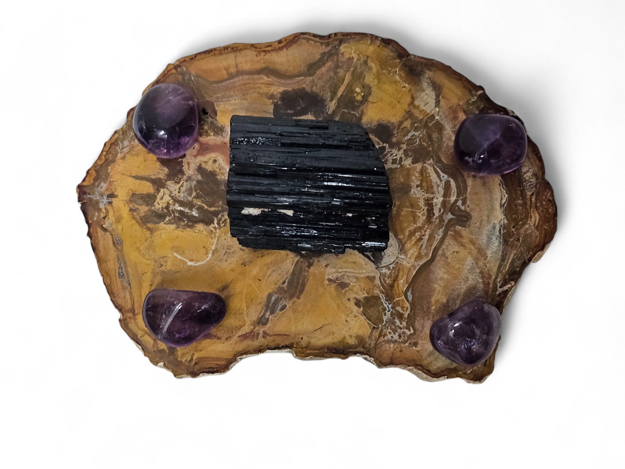 SHOP NOWCreate a shield of calm, grounded protection with our minimalist Protection Grid. Centered on the ancient energy of petrified wood and the powerful shielding properties of black tourmaline and amethyst, this grid offers energetic stability, clarity, and peace in any space.